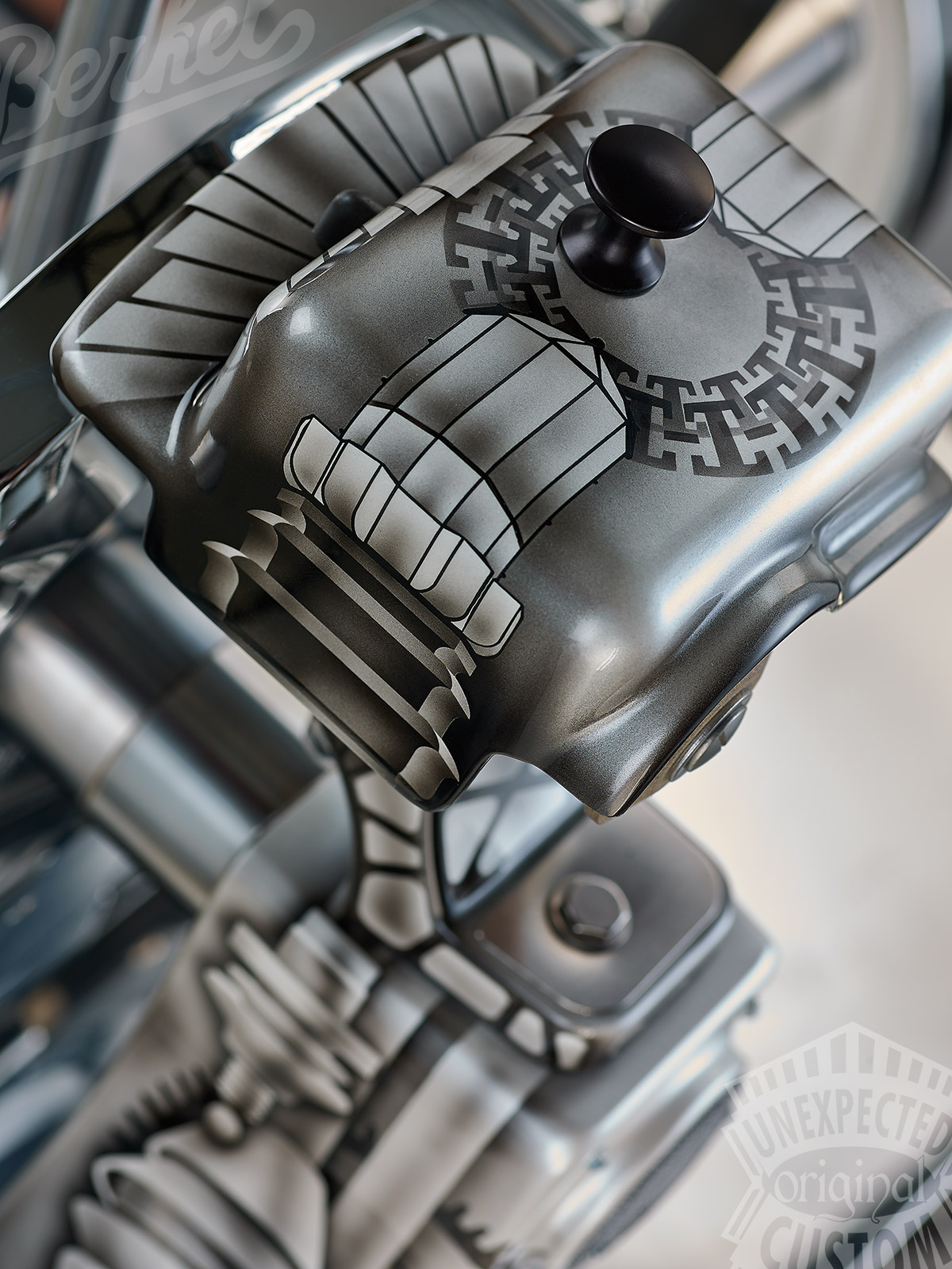 The fourteen studs, in place of the speike nails, can be seen as an alert, but they can also be a reference to Man Ray and his "Cadeu" full of nails, following a disruptive and ironic vision of Dada art in antithesis with the rigorous Bauhaus functionalism.