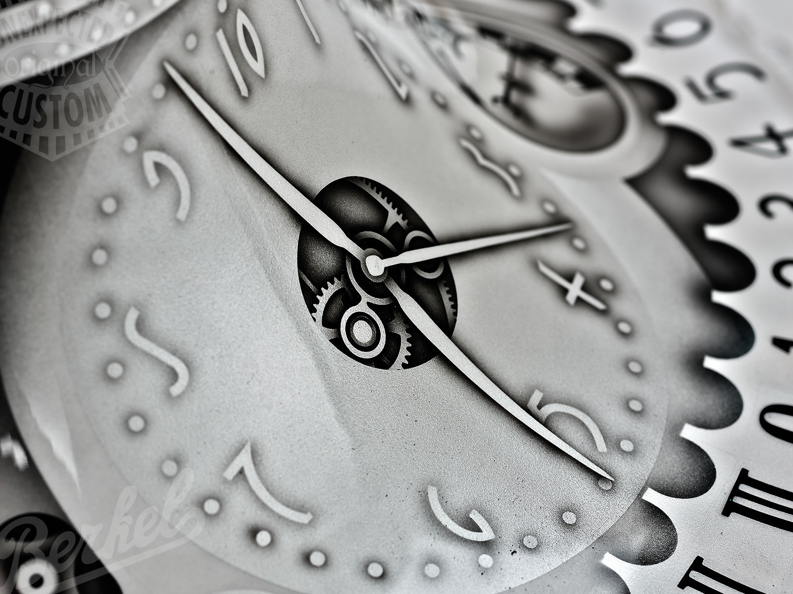 The clock, a chronological element often recurring in the six artworks on display, is taken from Modern Times. The factory worker played by Chaplin is so alienated due to his