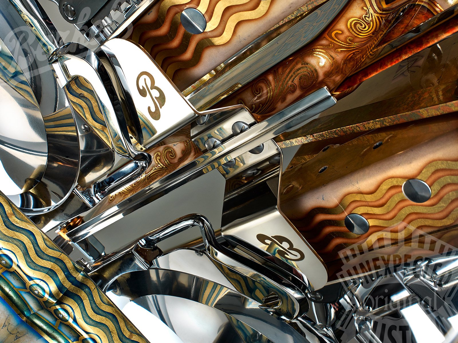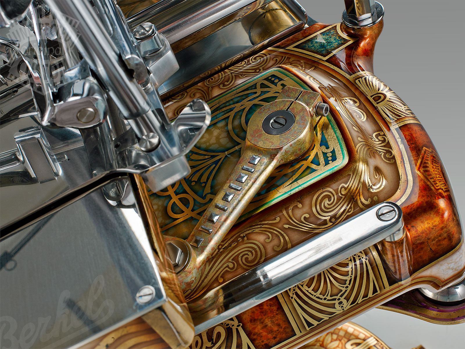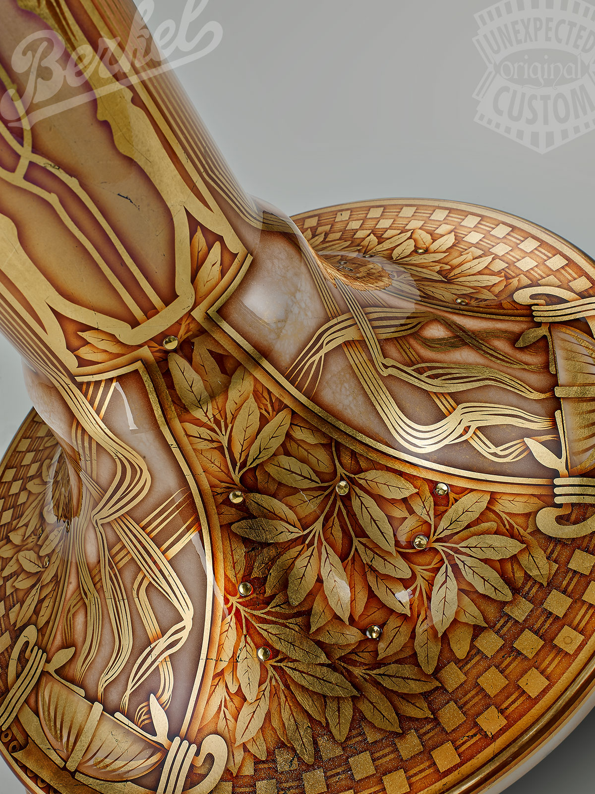 gold leaf, copper leaf, mother of pearl, transparent colors for glass, Swarovski studs.